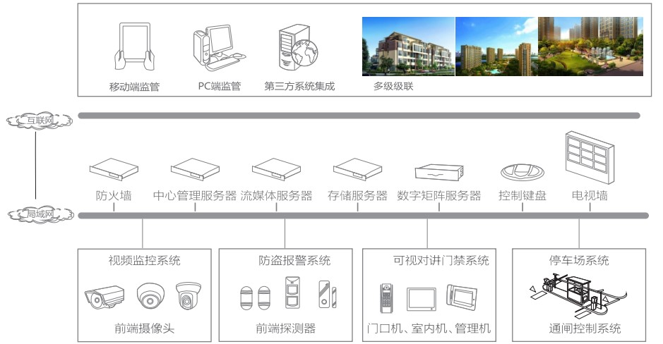 驰通达通过系统整合、智能分析、业务联动等多种安防技术的实现与应用,以综合管理平台为核心融合众多住宅小区安防子系统应用,实现系统的集中管理,同时利用智能化手段提供多个小区场景的主动式防范措施,优化管理效率、降低工作强度,提高警情响应速度等,实现各应用子系统之间的智能化联动和突发事件的应急响应。结合现代化小区物业服务至上的经营管理理念,可在后期为住宅小区提供物业增值服务、园区消费一卡通业务等,进一步提升住宅小区的生活品质,为智能化小区提供最优化的综合管理解决方案。